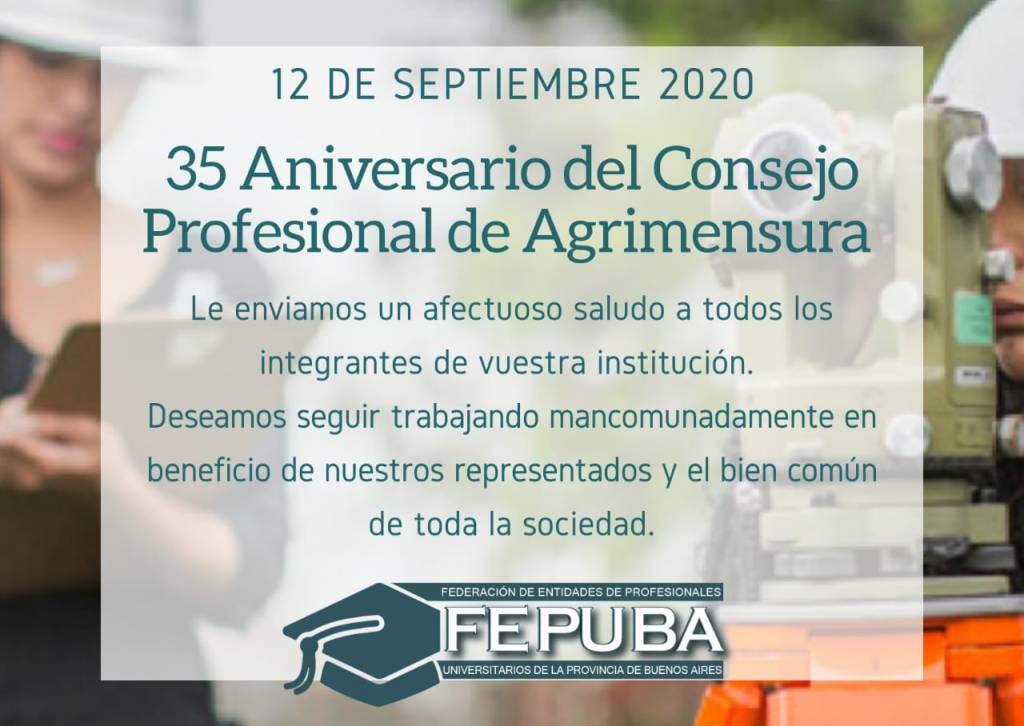 Con motivo de celebrarse los 35 años de la creación del Consejo Profesional de Agrimensura de la Provincia de Buenos Aires, hito relevante en la historia del movimiento profesional de nuestra provincia, desde la Federación de Entidades de Profesionales Universitarios les enviamos un afectuoso saludo.