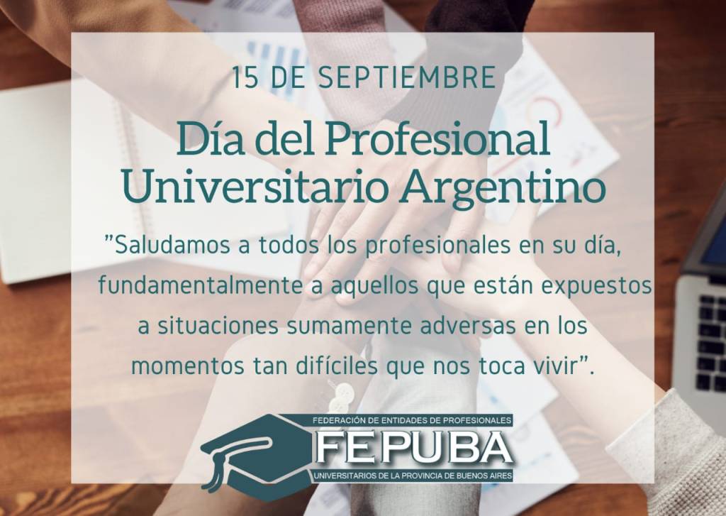 En este 15 de septiembre, día en que se conmemora el «Día del Profesional Universitario Argentino», desde FEPUBA hacemos extensivo un cordial saludo a todos los profesionales de la provincia de Buenos Aires y, a través de ellos, a todas las entidades de representación que día a día -como nuestra institución- trabajan en la defensa de nuestros derechos y dignidad.
