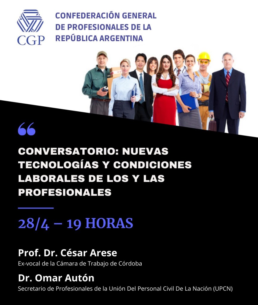 La Confederación General de Profesionales de la República Argentina (CGP) invita al Conversatorio “Nuevas tecnologías y las condiciones laborales de los y las profesionales” a realizarse el miércoles 28 de abril de 2021 de 19 a 20.30hs. a través de la plataforma zoom.