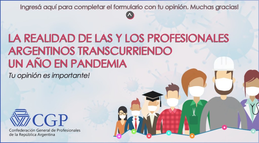 Desde la Confederación General de Profesionales de Argentina (CGP) nos encontramos realizando un relevamiento sobre la situación laboral y de trabajo de las y los profesionales de la República Argentina, transcurriendo un año en contexto de pandemia con las exigencias que demandó la nueva normalidad.