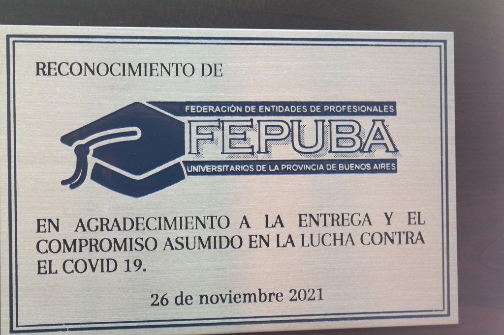 En esta ocasión, desde FEPUBA se hizo entrega de una placa conmemorativa a las entidades vinculadas con el Equipo de Salud, en «agradecimiento a la entrega y el compromiso asumido en la lucha contra el COVID-19».