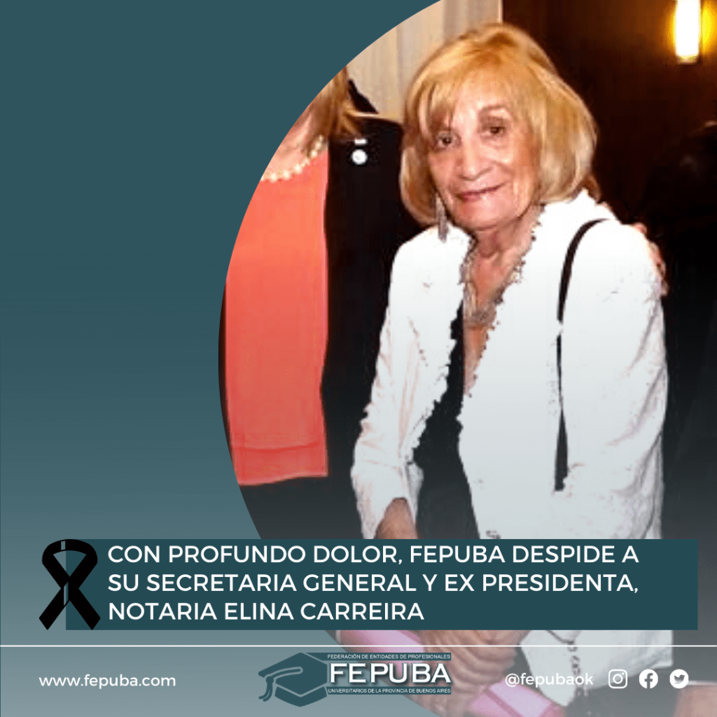 La Federación de Entidades de Profesionales Universitarios de la Provincia de Buenos Aires hace manifiesto su hondo pesar por el fallecimiento de su actual Secretaria General y Ex- Presidenta, notaria Elina Carreira, destacada e incansable profesional, de una amplia trayectoria tanto en el campo laboral como en el ámbito de la actividad institucional.
