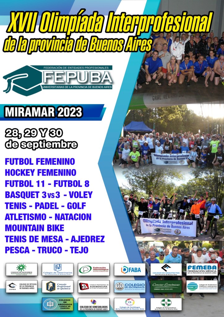El 28, 29 y 30 de septiembre se llevará adelante en la Ciudad de Miramar la XVII Olimpíada Interprofesional de la Provincia de Buenos Aires organizada por la Federación de Entidades Profesionales Universitarias de la Provincia de Buenos Aires.
