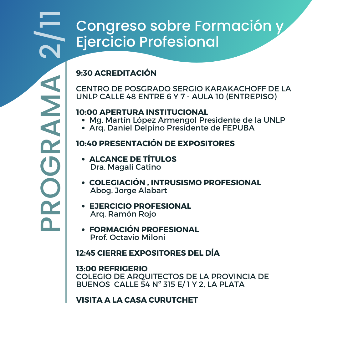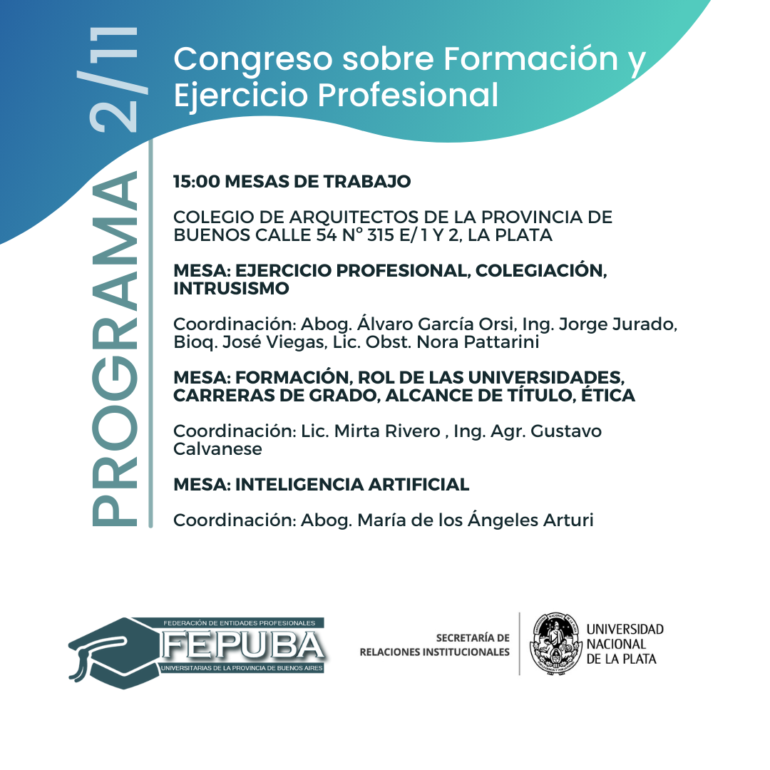 La Federación de Entidades Profesionales Universitarias de la Provincia de Buenos Aires (FEPUBA), junto con la Secretaría de Relaciones Institucionales de la Universidad Nacional de La Plata a través del Consejo Consultivo Profesional, invita al Congreso sobre Formación y Ejercicio Profesional que se llevará a cabo los días jueves 2 y viernes 3 de noviembre.