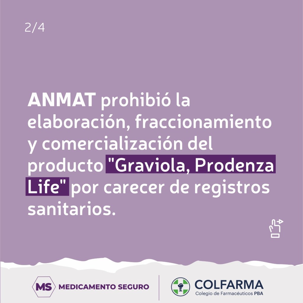 ANMAT prohibió la elaboración y venta de un suplemento «anticancerígeno» Graviola, marca Prodenza Life. El suplemento carecía de los registros sanitarios requeridos para su comercialización.