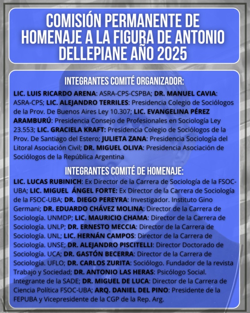 El pasado sábado 31 de mayo – en las vísperas del Día del Sociólogo conmemorado el 1 de junio- la Federación de Entidades Profesionales Universitarias de la Provincia de Buenos Aires fue parte de la jura nuevos matriculados, y del homenaje a Antonio Dellepiane, organizado por el Colegio de Sociólogos y Sociólogas de la provincia de Buenos Aires.