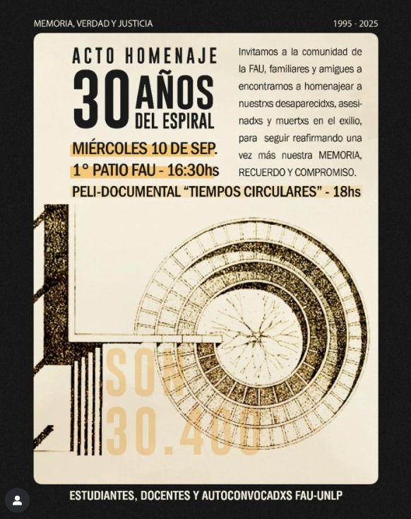 En el marco de un emotivo encuentro de memoria, verdad y justicia, se conmemoraron los 30 años de la inauguración del “Espiral”, obra creada por los arquitectos Roberto Saraví, Jorge García y Daniel Delpino, presidente de FEPUBA, que desde 1995 constituye un símbolo de homenaje a estudiantes, docentes y graduados/as desaparecidos/as de la Facultad de Arquitectura y Urbanismo de la UNLP.