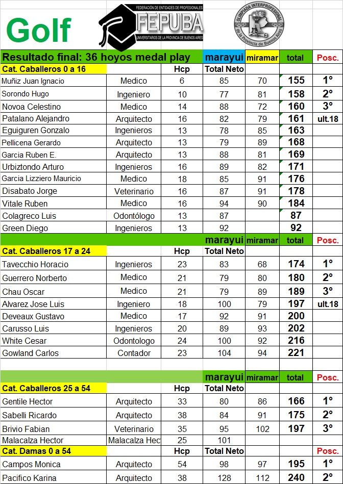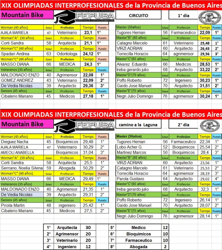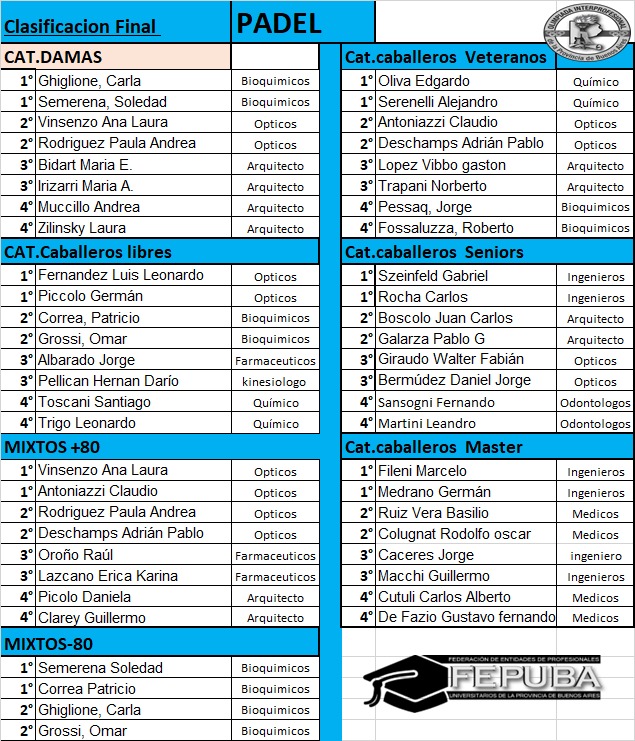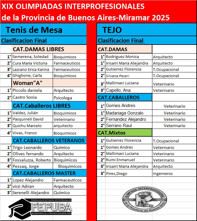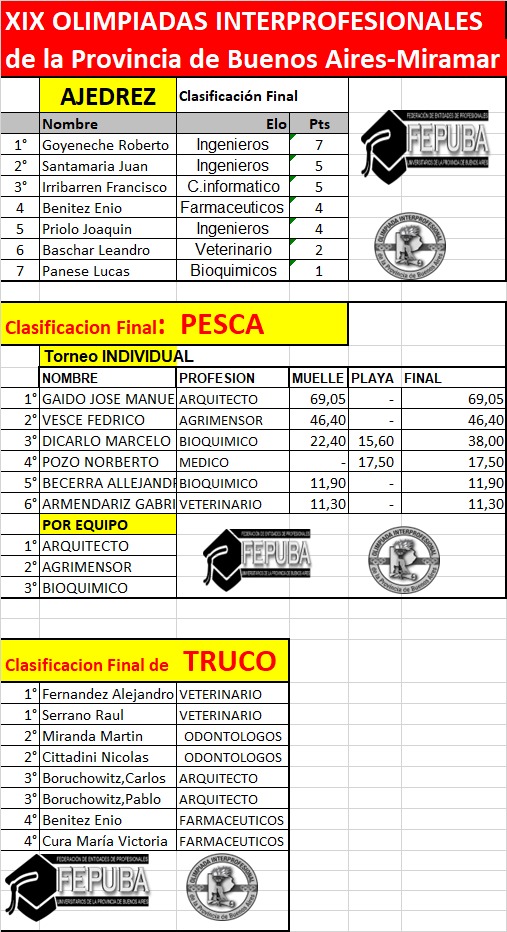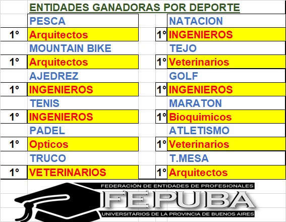 Así, en su decimonoveno año de realización, el certámen deportivo convocó a profesionales nucleados en 12 entidades miembro de FEPUBA, provenientes de distintos puntos de la provincia, los cuales compitieron deportes tales como fútbol, tenis, ajedrez, tenis de mesa, mountain bike, padel, natación, vóley, tejo, atletismo, basquet, truco, maratón, golf, y pesca, entre otros.